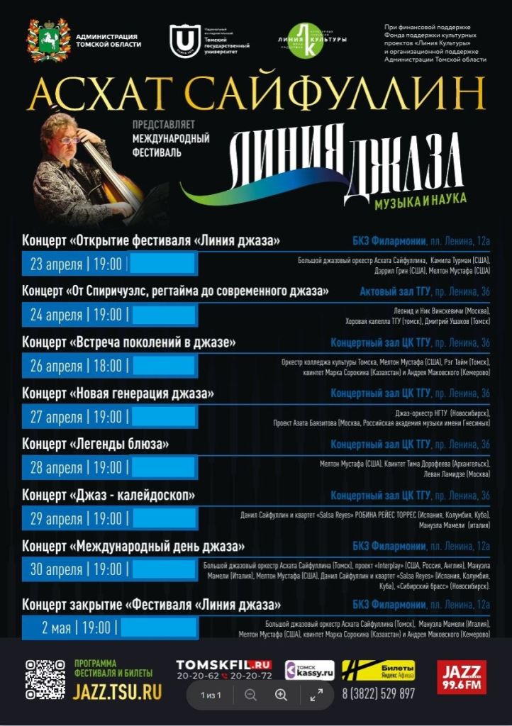 У Вас есть уникальная возможность получить льготный пригласительный билет на благотворительные концерты международного фестиваля «Линия джаза: музыка и наука» в Томске с 23 апреля по 2 мая 2026 года!